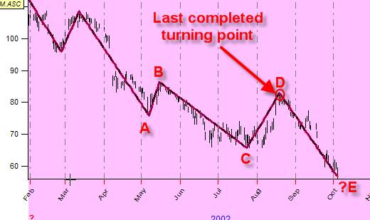 a) last turning point (August 19, 2002) is top, it means that the next turning point is going to be bottom;