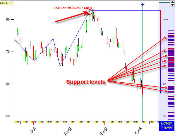 The program automatically recalculates statistical criteria and updates the Main screen. Thus you can observe all possible support levels very quickly, though always watch the last turning point, whether it is a top or a bottom.