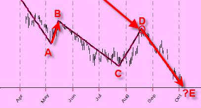 The simplest approach to find the length of down D-E swing is to analyze the proportion between all preceding up and down swings using all available price history and performing the statistical analysis for these proportions. Once the most probable proportion is found, the height of D-E down swing can be determined using the height of previous C-D up swing.