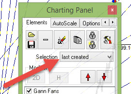 You can select a specific tool in the Charting Panel from the Selection drop down menu. Selecting "Last created" will select the last tool that has been created.