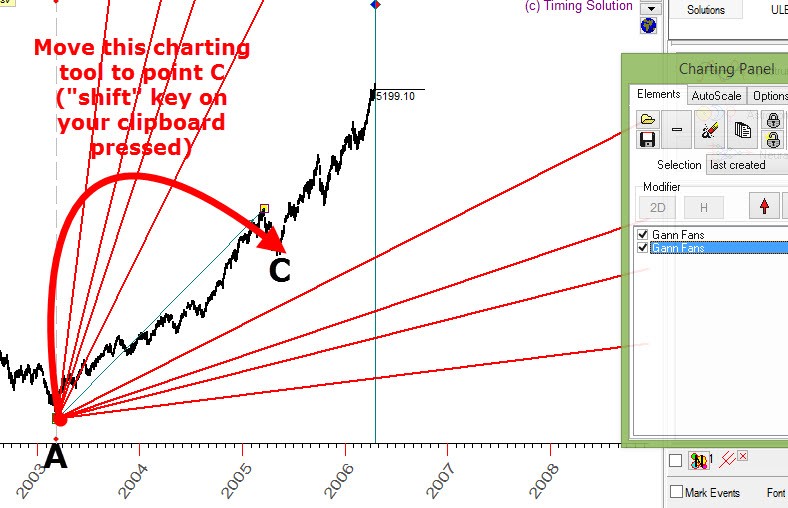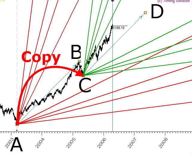 In the example above we have created the charting tool Gann fan A-B, made its copy and moved it to another initial point C.