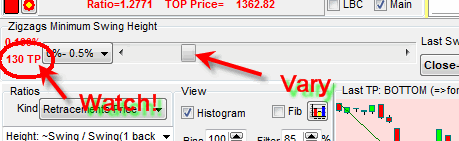 The minimum of turning points should be 50, better 100 or more. You can also vary the amount of turning points dragging the scroll bar. This way you change the zigzag critical swing that is used to calculate the turning points.