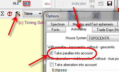 Imagine now two friends. One of them lives in New York, while the other lives in Moscow. Both are looking at the Moon at the same time and measure accurately the Moon's position. They will be surprised as the position of the Moon will be different. This difference can reach 1 degree in longitude. It is called "parallax". For intraday trading models this difference can be critical, so you may set the parallax for astronomical calculations through "Options" in "Astronomy" tab: