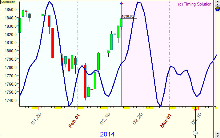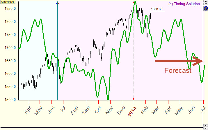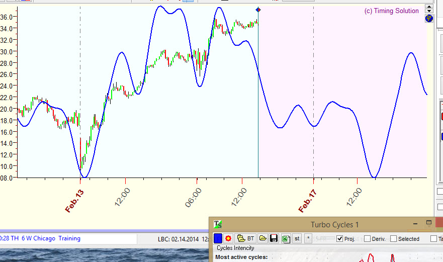 As you see, this forecast is made on February 14, 2014, as the last price bar here is February 14, 2014. The projection line prolongs this price chart further, and it gives us some hints regarding future price movements.