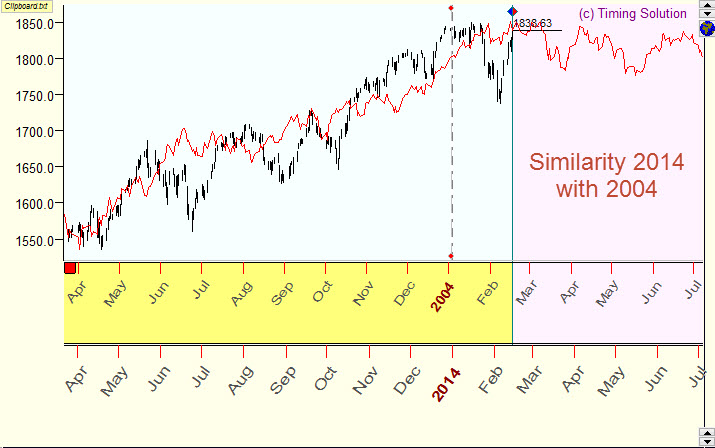 And this is the more specific example: the projection line calculated by Similarity module. The program searches the most similar period in the past, and this chart can be used as a future forecast tool. In this example there is some similarity between the price movement in 2014 and in 2004. We do know the actual price movement in 2004, so we can use this price chart as a forecast tool: