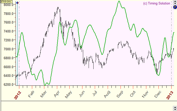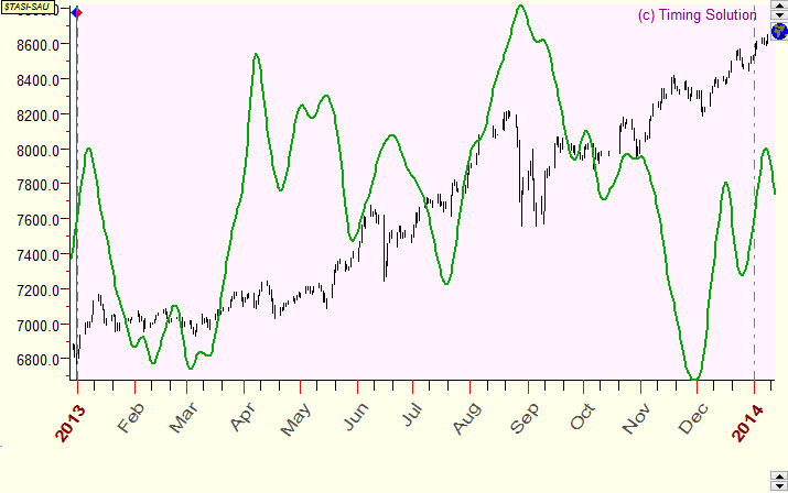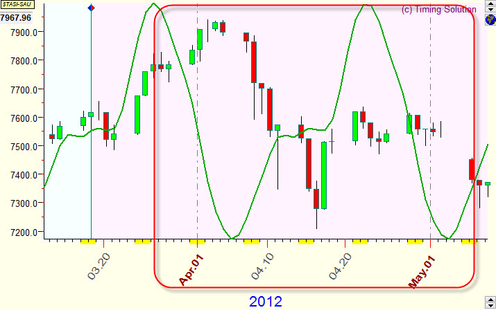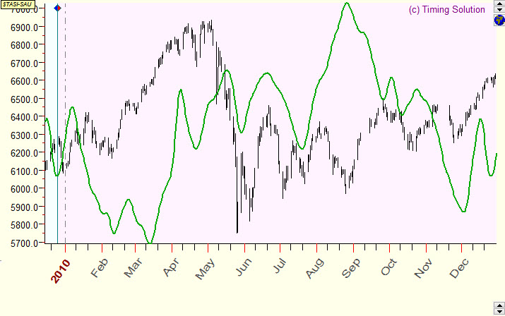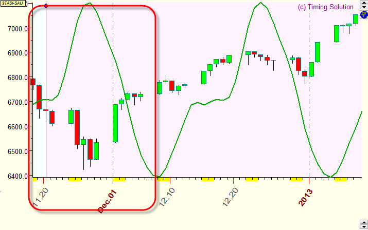 Below are random examples of verified projection lines together with corresponding price charts. Samples are done for Saudi Arabia All share index (TASI), and as a model for projection lines the Moon based cycle is used. The average forecast ability of this cyclic model is 10% (correlation=0.1). Usually, though they do not explain everything, such projection lines (with the correlation around 0.1) reflect some market movements that can be seen on the price chart. This info alone is not enough for successful trading; however, it contains a unique information that cannot be obtained by other methods of analysis.