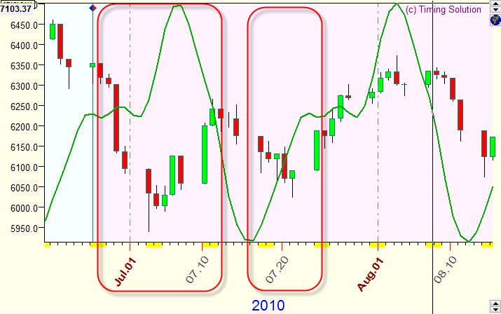 In most cases the projection line forecasts not the price itself; it forecasts turning points mostly. As an example, let us consider the projection line based on Annual cycle and the price chart for the last five years: