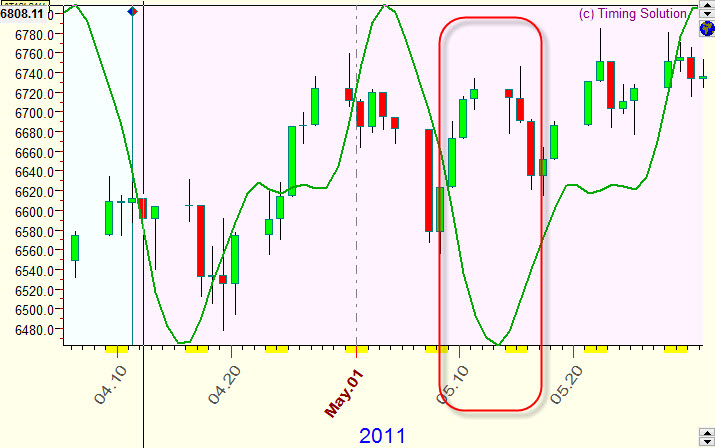 One more example, the projection line based on dominant cycles calculated for 5 min S&P. This is done by Turbo Cycle module of Timing Solution software; it conducts sophisticated cyclical analysis fantastically fast in real time mode: