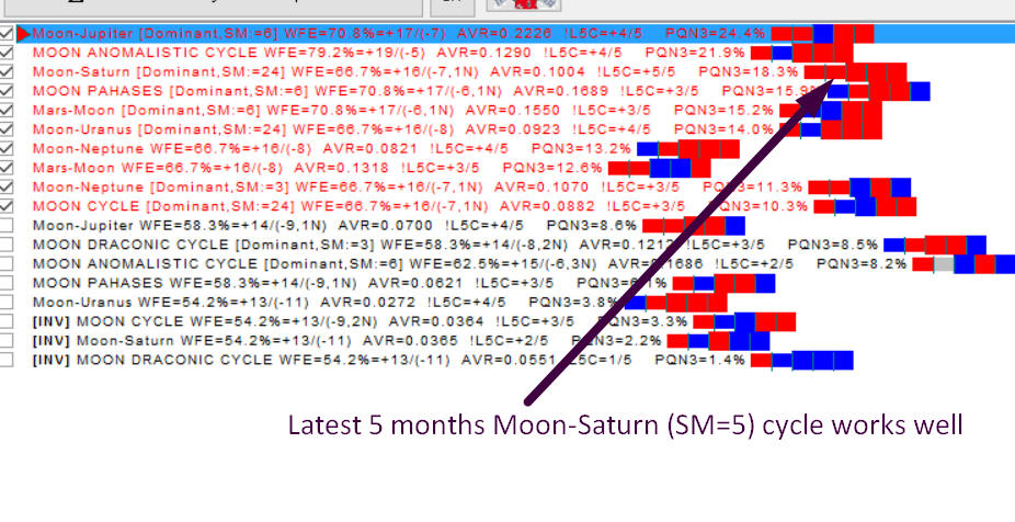 - dominant cycles work for some restricted period only, so you have to use smaller SZ. By default we use SZ=24; for Moon based cycle it means that this cycle works the similar way within 24 months, i.e. two years. As for dominant cycles, you may play with smaller sample size. Try to set it to 12, i.e. we will look for the patterns that work within one year (for Moon based cycles). In this case pay attention to the last %X cycles parameter, i.e. the number of the last months when this cycle should work good; in this case, last several interval bars should be red ones, like this:
