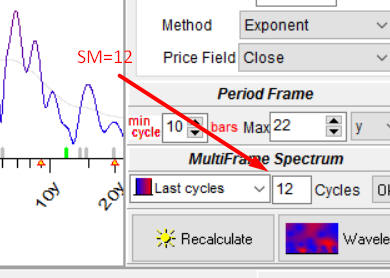 As an example, consider dominant 100-days cycles with the stock memory five (SM=5). We assume that this cycle works for 5x100=500 days, after that it does not work at all (dissappears) or works another way. That means that we should recalculate it after 500 days.