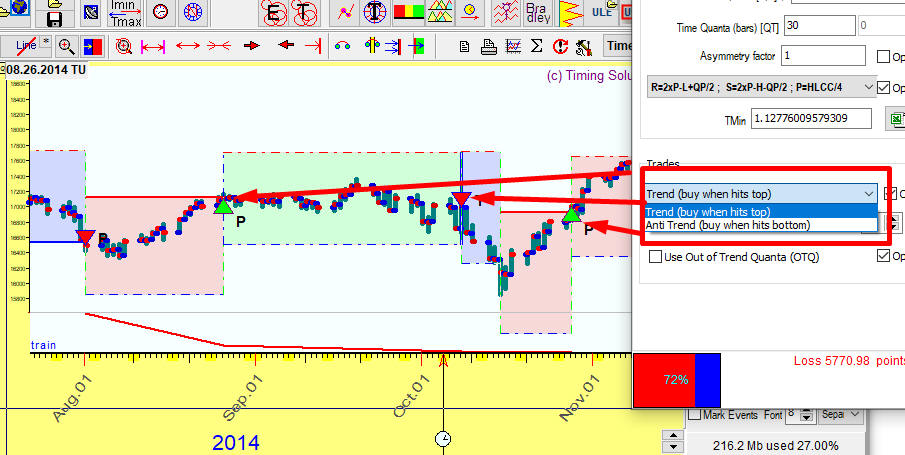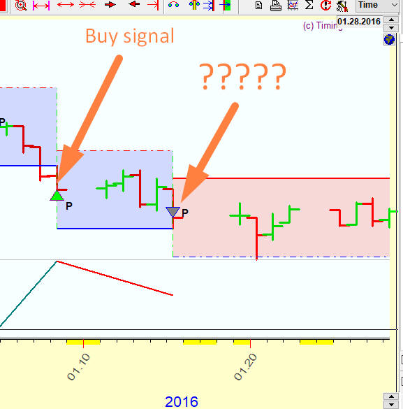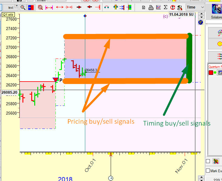 Thus, one and the same quantum figure provides two types of trading signals. We can call the first type of those signals "PRICING signals" and the second ones "TIMING signals". These signals are marked by symbols P (i.e. pricing) and T (i.e. timing) accordingly:
