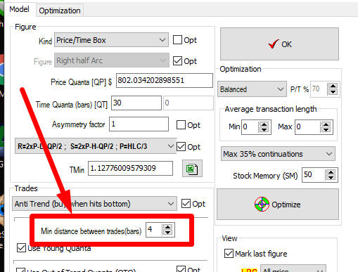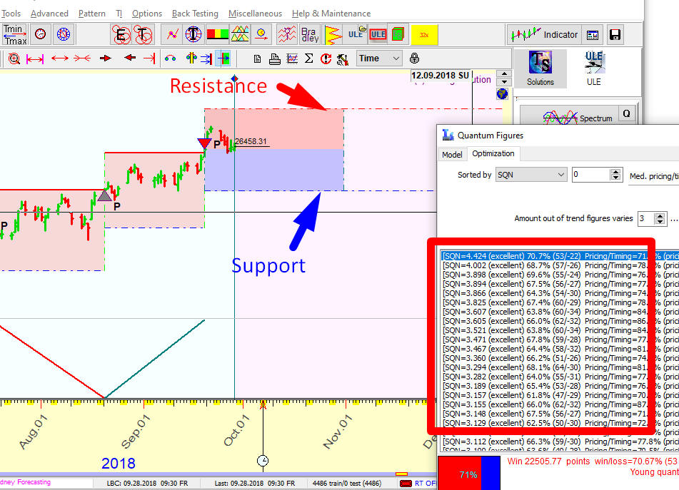 Shortly the list of most profitable quantum models will appear. It is recommend to check these model one-by-one, choosing the model with the best equity curve. Each model generates uncompleted quantum figure, the sides of this rectangle can be used as support and resistance levels for anti-trend models: