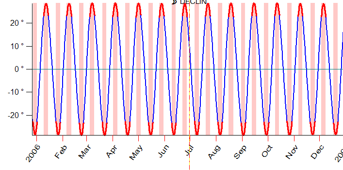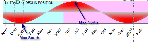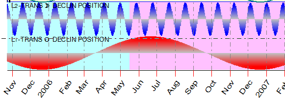 Let us go back for a minute to the Sun declination picture (see above). The star Sun creates the most regular pictures in the sky thus setting the legal bands for other planets' movement as 23degrees 27 minutes to both sides. Usually, the planets move inside this band (as to paying their respect to the most important person in the Solar system; immediately all ancient legends come to mind, with the Solar god in the middle). However, sometimes they are able to break these rules and spend some time outside these legitimate 23.27 degrees. These zones are called "Out of Bounds". Actually, these zones are very interesting. See this diagram for the Moon breaking the rules stated by the Sun in 2006: