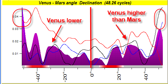 Question #3. What does happen when Venus declination is higher/lower than Mars declination?