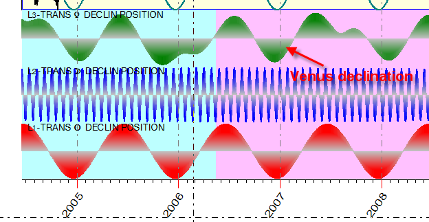 The Venus declination line is not so regular as the Sun's or the Moon's. The reason is so called retrograde movement of Venus sometimes. However, this fact makes the Venus declination cycle (and the declination cycles of other planets) very suitable for stock market prediction.