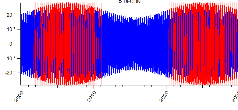The red zones correspond to the Moon "Out of Bounds". You see there 9-year periods when the Moon is allowed to move out of border, and then there is 9-year period when the Moon does not break these borders. Together, they make an 18-year Lunar cycle (so called Saros cycle).
