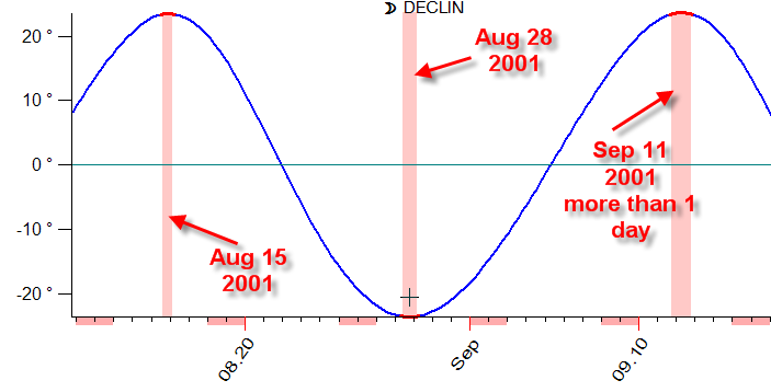 The Moon left the legitimate borders for several hours on August 15, 2001, then for a little bit more time on August 28, 2001, and on September 11, 2001 the Moon spent outside these Borders more than one day. I do not want you to take this as the explanation of the great tragedy that has happened that day; I only state that at that day the Moon (our emotions) was for more than a day out of the Sun's boundaries.