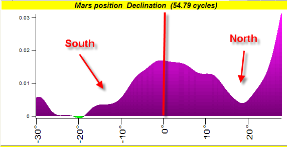 You see that in general the values are higher for the North part, especially when Mars reaches 23 degrees of its North declination; in this case, the DJI is pretty high.
