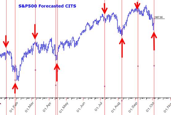 11. The following is a very basic quick example to illustrate the potential. It shows the triangles used to forecast the turn points illustrated in the first screen shot above. It is based on the S&P 500 as at 3 October 2014 (ie most recent prices when this was written). Look for potential price action around 3 November? (Note that the triangle point at 2 October may not be a valid turn point - it only looks like it could be using the data available at 3 October).