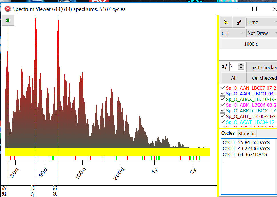 Thus you can see together the most important cycles for any financial instrument (Q-Spectrum chart) and cyclical genome that indicates the most probable cycles for 1300 American stocks.