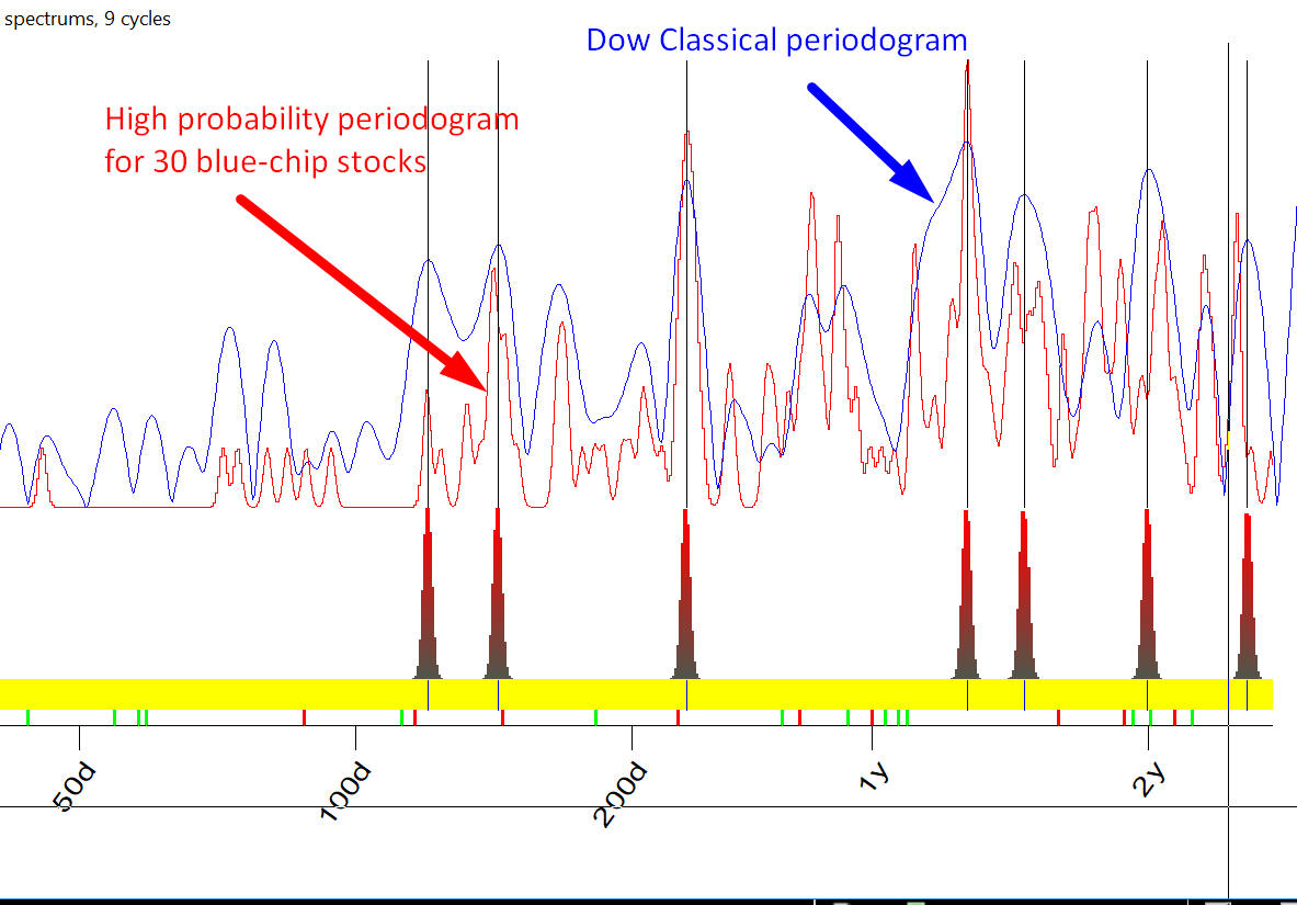 You see, the cycles (i.e. peaks) for both are significantly different, though some cycles are common: two years and 239 days cycle. To understand what is going on there I have calculated high probability periodogram for 30 blue-chip stocks. They are shown in red together with classical spectrum for Dow (blue):