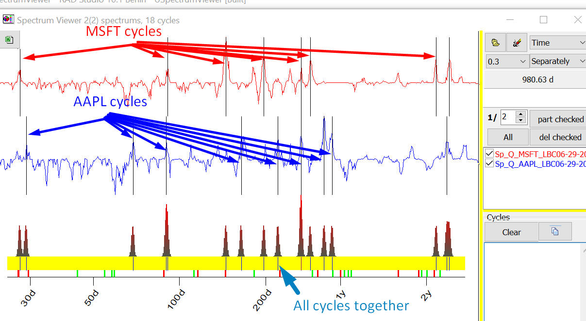 Now look at blue panel there, vertical stripes there indicate ALL cycles together i.e. cycles for MSFT and APPL. The cycles for MSFT and AAPL are pretty different, though three cycles are the same: 90, 264 and 870 days cycles.