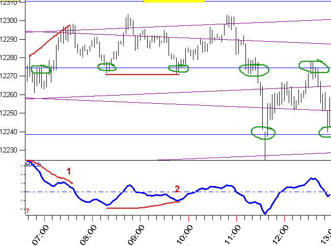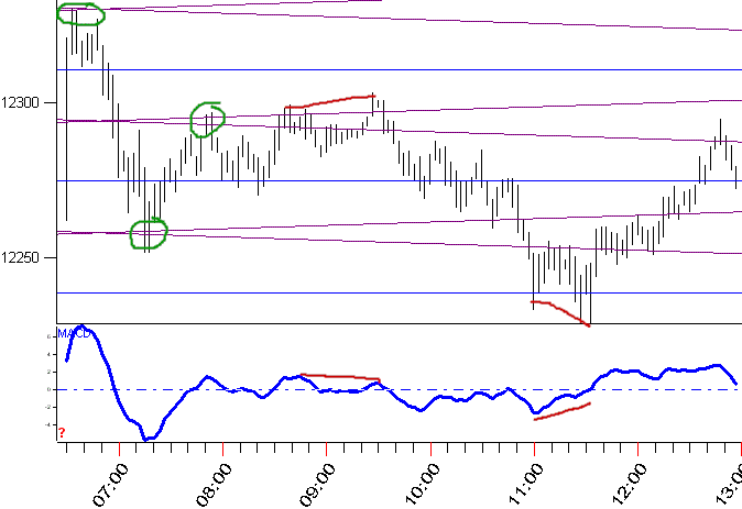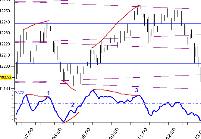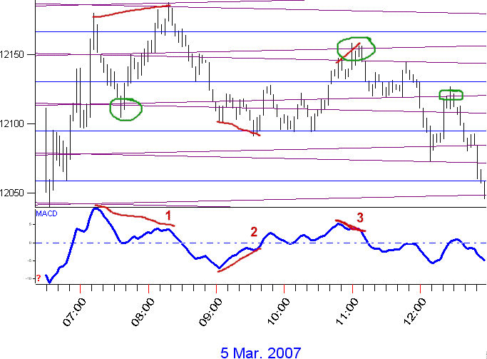 On Monday March 5, at 1 we see the index has risen to the Vertex PL's while at the same time the MACD Histogram has fallen - this is classic momentum divergence. While its good by itself our method is to spot momentum divergence when price is at one of our PL's. This divergence at a PL means to sell. This greatly enhances the accuracy. At 2 the Index fell below its prior pivot but the MACD was already rising - so we are ready to buy. At 3 we have a higher high but the MACD is falling - so we set up to sell. The green circled areas are another type of setup. Look at the first one - the market has been rising and it corrects to our Vertex PL's - if a pivot forms there, we're confident higher index values are coming. Next, at about 8:20(PT) the index started to fall - the second green circle shows it rallied to our Vertex PL's, then the downtrend resumed. And the third green circle is the same - if a pivot forms on one of these PL's during a correction, you're interested.