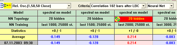 The first thing you should do is to find the optimal training interval for the Neural Net. "Optimal" means the interval that is enough to find the major important factors. We do it through Back Testing module: