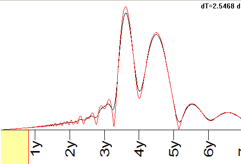 Thus, we have got the main cycle of 3.6 years (which is confirmed by the spectrum results for the real DJI data - see above). Besides, there is one more cycle with a period of 4.5 years approximately (for the real DJI data, it is 5 years).