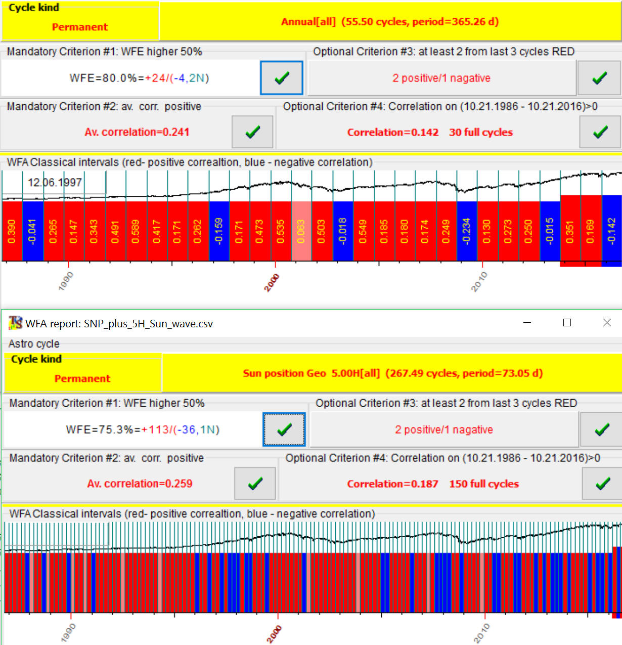 Regarding harmonics, this is the same story. We are tossing the one and the same cycle. I've prepared a special example to explain how it works. I have downloaded SNP500 since 1960 and have added 5H Sun cycle to this data. In other words, in this data 73.053 days cycle is definitely present. Let's conduct walk forward analysis for 5H Sun cycle; it shows that - Yes, this cycle works. But let's conduct walk forward analysis (WFA) for the whole Sun cycle; and WFA shows that this cycle works as well. Here are results of both WFAs: