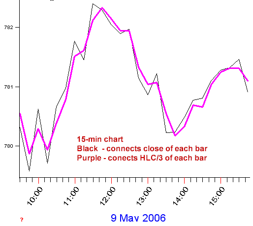 The first step in reducing market noise, or smoothing as I call it, starts with deciding how you'll present each row of intraday data. In the below image the black line connects the closing price of each 15-minute price-bar. The purple line connects the median price, defined as (High + Low + Close) / 3. By looking at the below image we see that both lines clearly show the price movement for the day. But the median price without a doubt reduces the market noise, or choppy volatility. How this is relevant is shown in the example.