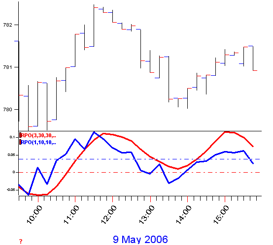 In trying to determine what cycles are present in a price series or what criteria effects price movement it would be good to repeat again that we don't use the price-bar data itself due to excessive market noise. What I've settled on is using a Relative Price Oscillator (basically a no-lag formula using three moving average). Below the red-line is a Relative Price Oscillator (RPO) that uses the Median price and values of 3 and 30, the blue line is a RPO using the Closing price and values of 1 and 10. (for TS users, both are Symmetric) As my goal is to forecast the largest swings of the day, and nothing but that, I can immediately see that the Median RPO captures the swings with none of the noise! Its a milestone checkpoint to be able to pre-process non-linear data like this.