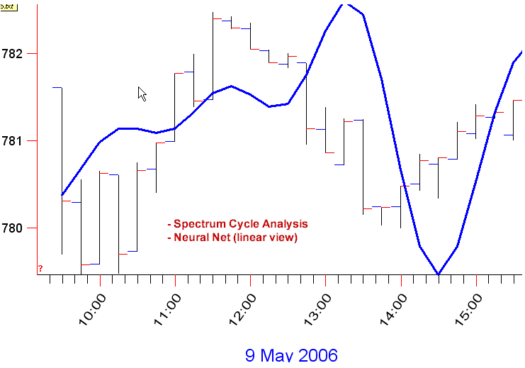 While TS possesses a sophisticated Neural Net, I set its parameters to use it in its simplest possible form - in linear mode, where it will mainly just combine the cycles to produce the forecast. In creating this forecast I took care to just let the Spectrum and NN see data between March 1st and May 8th. This makes the below image a real forecast that could have been created prior to the start of the May 9th trading day. Looks pretty good but its not tradeable by itself. We'll see how to use it further down.