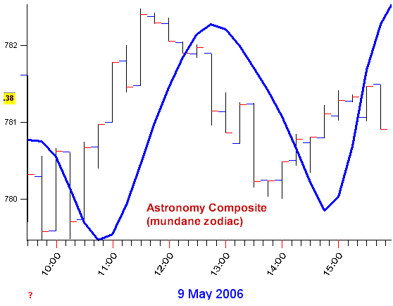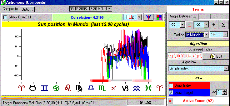 For the astronomical fixed-length cycles forecast I'll be using TS's Astronomy module. Again, I'm using the same Median RPO used above (but for 15-minute data) instead of raw price data. What is exciting about this module is the internal development of a new zodiac specialized for intraday data - its called the "mundane zodiac". It rescales planetary cycles by focusing on the Sun's movement - in our 24 hour day, the Sun moves 1 of its 360 degrees in 4 minutes. In the Mundane zodiac all the other planets are scaled proportional to the Mundane Sun.