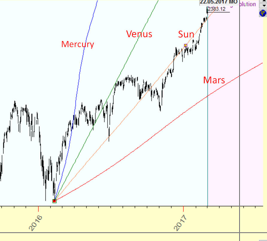 These cycles with the center at BOTTOM June 27, 2016 represent 30, 60, 90, 120 ... 360 degrees cycles. As a scaling angle, we use the angle separation between the San and Mars geo. Also we use price/time ratio $1 of price movement equal to 1 degree of Sun-Mars geo increment. Thus we can calculate a distance between two price/time points on our price chart and accordingly calculate equidistant cycles.