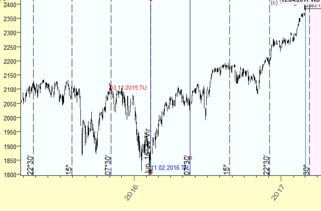 You can apply here any planetary combinations and angles, geo and helio Zodiacs. For example, this chart shows 7 degrees 30 minutes Jupiter steps starting from BOTTOM February 11, 2016: