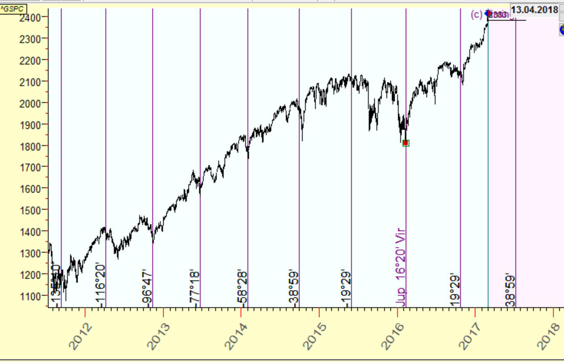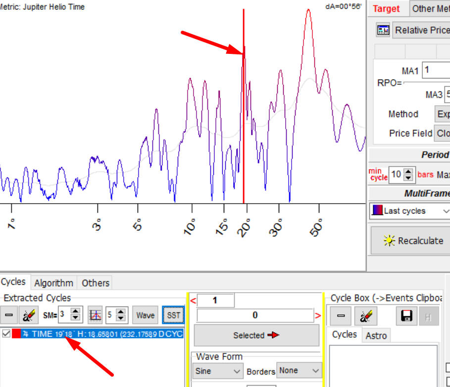 We even can apply heavy mathematics to hunt the most promising angle increment. Look at this spectral analysis that shows that Jupiter helio 19deg18min cycle is strong (peak):