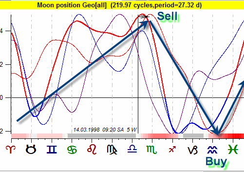 Buy when the Moon passes 12th degree of Aquarius and sell when the Moon passes 2nd degree of Scorpio. The angle separation between these signals is big enough. This system provides 56% winning trades (223 win versus 174 loss). This is how this model would work for the last year: