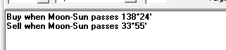 Buy when the angle between the Moon and the Sun reaches 138 degrees and sell when this angle reaches 33 degrees. We can formulate this trading system easier to memorize: buy three days before the Full Moon and sell three days after the New Moon.