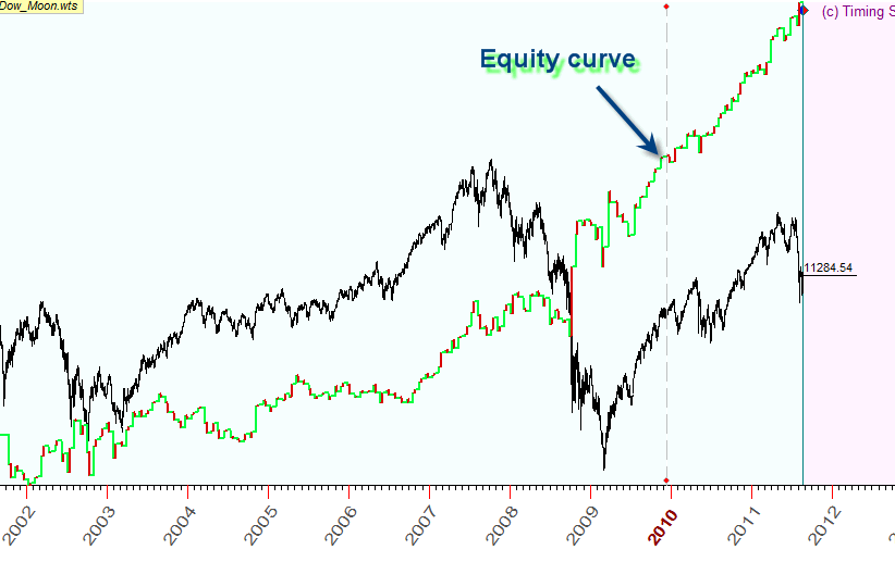 In this article the general approach of astro based systems has been introduced. Do not take them as a ready-to-use trading system. I do not think that for daily data this is possible. For deeper analysis of this trading system we need to use back testing approach.
