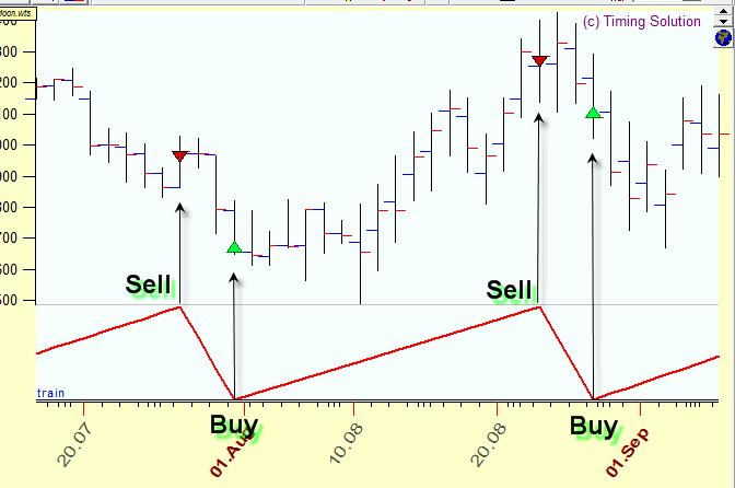 Example #2: We may trade using the Moon phases. Researchers all over the world note that the Moon actually affects the stock market. Usually a typical research states that the price is higher around the New Moon and lower around the Full Moon. This is a practically ready trading system: buy when the price is low i.e. at the Full Moon and sell around the New Moon. This is how this strategy works within last six months: