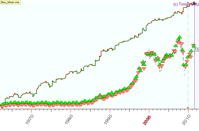 As you see, this system generates Buy signal when the Moon passes 4th degree of Taurus and Sell signal when the Moon passes 21st degree of Pisces. In other words, buy and sell signals are located very close, 2-3 days difference. Close located signals mean that this system does not work, this is practically a "buy-and-hold" system. It also means that within 50 years interval we cannot specify some stable Moon pattern, within 50 years this pattern has being changed. So now try to download less price history and perform the Moon cycle optimization once again. Download 40 years of price history, optimize signals and watch them. If these signals are close (i.e. the system does not work), download 30 years of price history and check this system again. I Have found that the system works when the last 15 years of price history are downloaded. Here is: