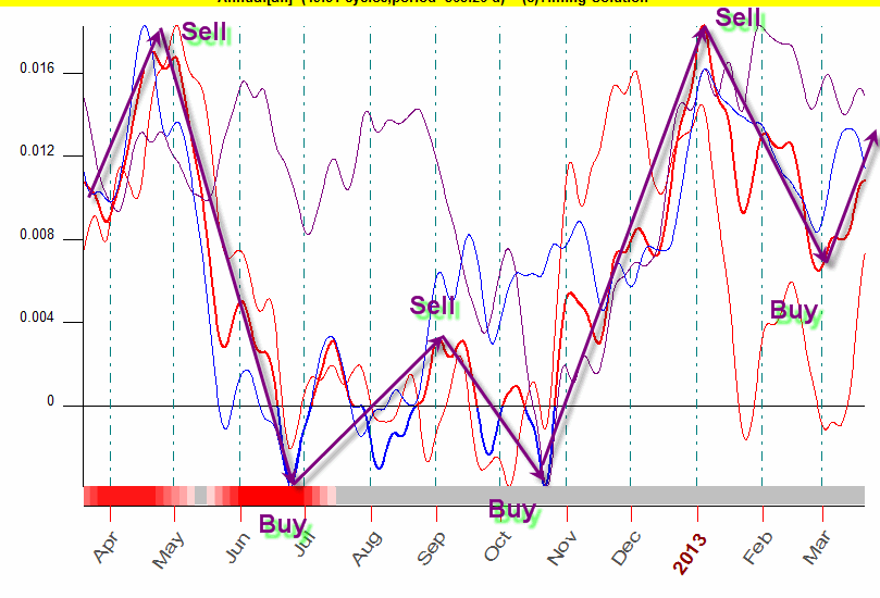The interesting fact is: the program for some reason has skipped two trades: sell signal around the New Year and buy signal in the beginning of March. This information cannot be revealed by a projection line; I believe T17 module provides a deeper insight in astro cycles. It incorporates the risk information in regards to some specific planetary movement or astro phenomenon..