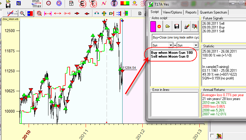 Creation of a such system became possible when the new module, T17, has been developed for Timing Solution software. This module allows fantastically fast and easy to verify this kind of a system. It means that we can take practically any astro statement regarding the stock market and make its quick evaluation. And you should do just a few mouse clicks, like in example #2 with the Moon phase trading system I simply type this: