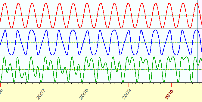 In other words the cycles that show increments of 126 calendar days (black), increments of Mercury's phase of 407 degrees (red) and increments of Mercury's geocentric position of 137 degrees (blue) provide different projections.