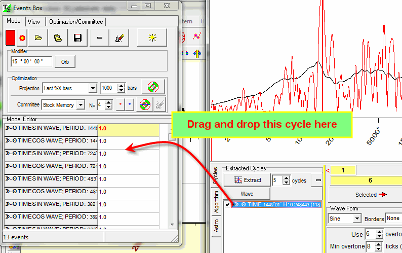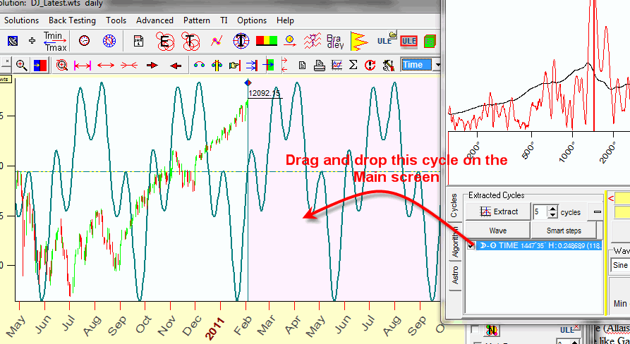 Specially developed for this purpose fast algorithms allow to perform these calculations fantastically fast. Now you can use the standard "drag and drop" technology to calculate the projection line based on this cycle: simply drag and drop this cycle on the Main screen, and the program will calculate this projection line practically immediately: