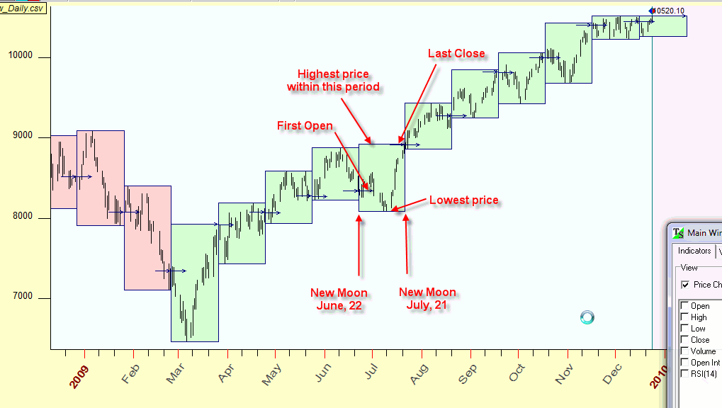 In other words, the program calculates how the price changes between two New Moons; we can see the highest and the lowest price within this Moon cycle and also the price at the beginning and the end of this cycle.