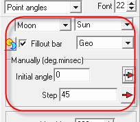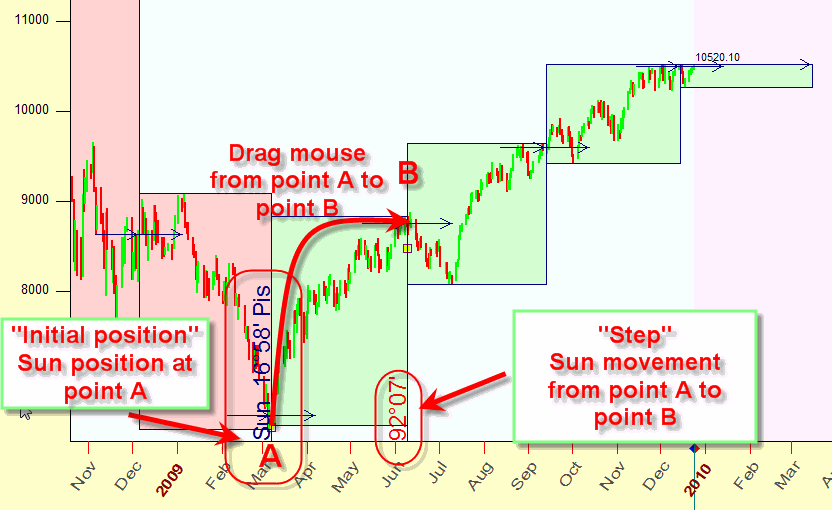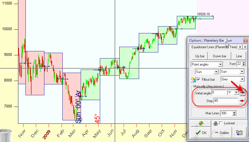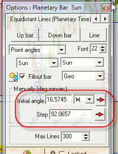 For example if you want to calculate price bars based on 45 degrees of the Sun movement with the initial Sun's position at 0 degrees of Aries, set these parameters there: