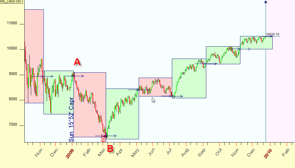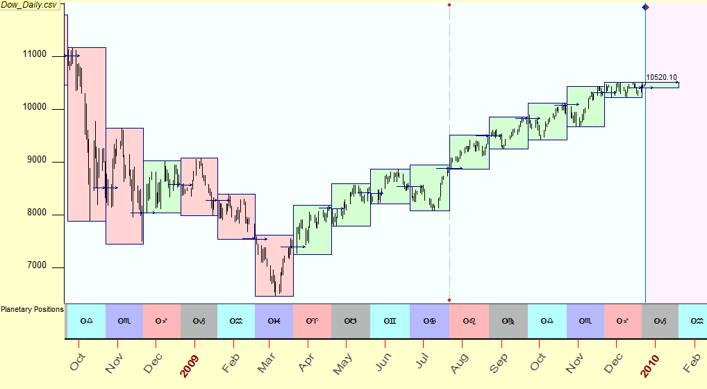 This technique is pretty obvious. Just look at this example. Suppose we have created Jupiter in Zodiac signs price bar chart. We have used these settings: