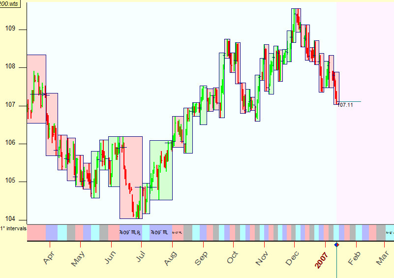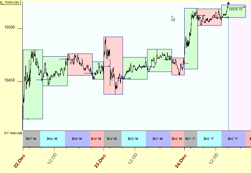 Now we want to calculate one more price bar chart that overlays the existing price chart and is based on 7 degrees 30 minutes of Jupiter's movement (7 degrees 30 minutes step). We can consider this chart as a fourth harmonics of Jupiter in Zodiac signs' chart.